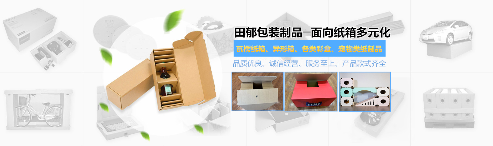 上海田郁包装制品有限公司,于2014年1月成立,现落户于上海市金山区吕巷镇朱吕公路7335号,厂房建筑面积约8000平方米。公司本着“品质优良、诚信经营、服务至上”的理念,产品款式齐全,质量可靠,主要经营各类瓦楞纸箱、异形箱、各类彩盒、宠物类纸制品等包装产品。